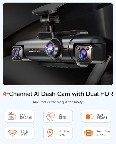 Dash Cam 4K 4 Channel, Dual HDR IMX675 IMX307, AI Dashcam with Driver Monitor System, 4K+1080P*3 Car Camera, 360° Dash Camera 5G WiFi GPS, 128GB SD Card Night Vision 24H Parking Mode, N900-4CH