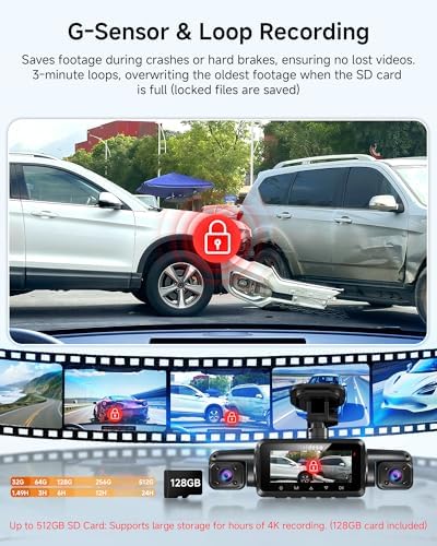 【G-Sensor Dashcams and Loop Recording】Car dash camera's sensitivity G-sensor will detects a sudden shake/collision and locks the footage to prevent video from being overwrote even in loop recording. When an accident is detected on the road, it automatically locks and protects the relevant footage, saving it in the "Event" folder for quicker access to locked video files. Every 3 min loop recording, the oldest videos will be overwritten when SD card is full. Included 128GB SD card, support 512GB